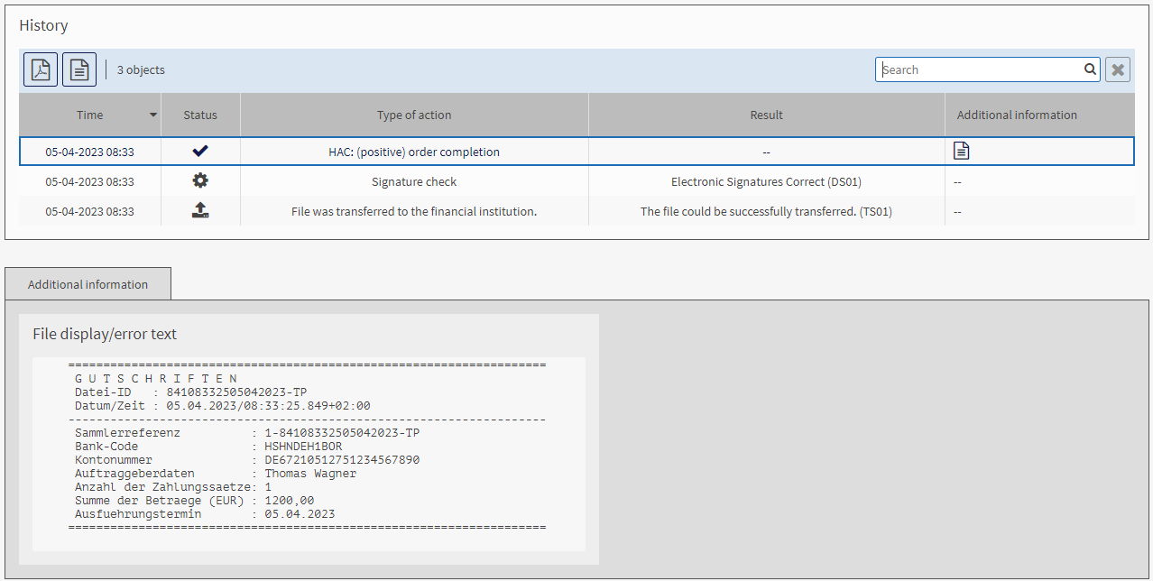 The upper mask area displays the current processing status of the order with the action performed and the result. If supplied by the bank server, additional information on the order is displayed in the lower mask area. |
