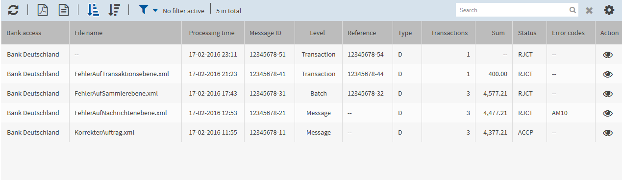 The menu item gives you an overview of the available messages (pain.002, PSR1). The messages for the respective levels are listed.