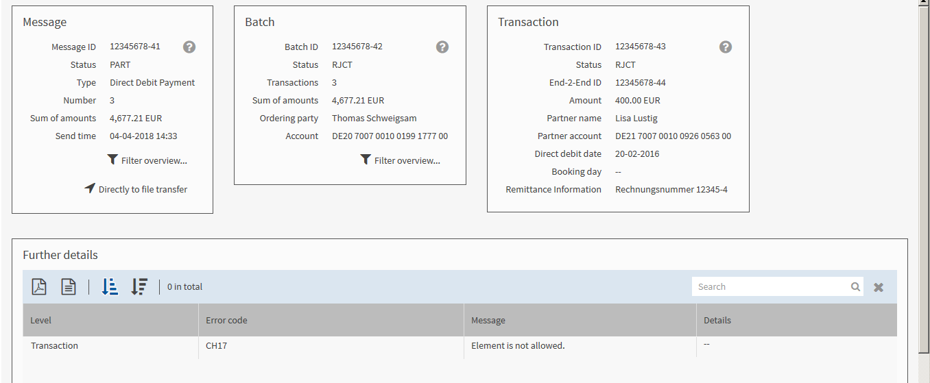 The example in the mask shows a rejected transaction 12345678-53 from the batch 12345678-52, which is partly rejected as not all transactions it contains are erroneous. The superordinate message 12345678-51 is also partly rejected. The error code indicates that an included element is not valid.