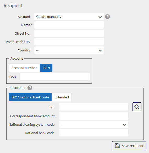 On some masks there are further field groups within a mask area that characterise thematically related fields. Field groups are visually separated from other fields or field groups by a frame. The figure shows the mask area Recipient with the field groups Account and Institution.